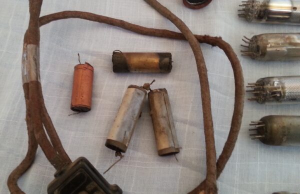 Conjunto de varios repuestos de  radio de válvulas. Compuesto por diferentes válvulas y algunos otros elementos. Para atrezzo y decoración.