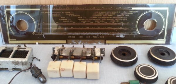 Conjunto de varios repuestos de esta radio de válvulas Philips. Compuesto por chapa identificativa, cristal frontal, botonera y algunos otros repuestos más.