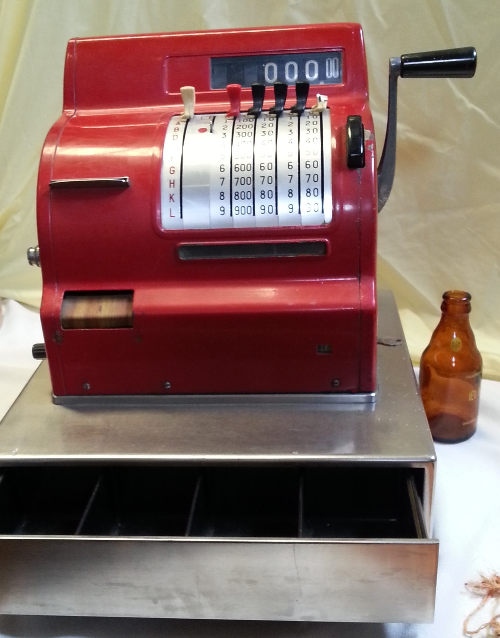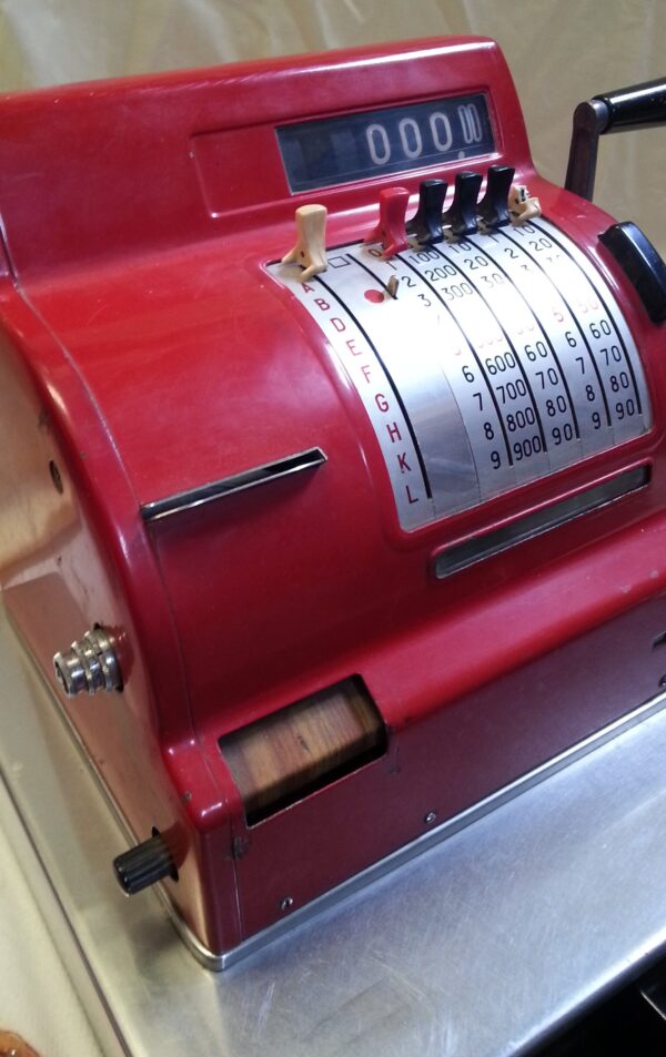 Funcionan sus teclas, su manubrio y abre su cajón porta-monedas. Conserva sus llaves originales tal y como se puede ver en las fotos. Es un maravilloso objeto de colección y decoración que conseguirá de su escaparate o mostrador un mayor protagonismo.  Magnífico colo rojo original.