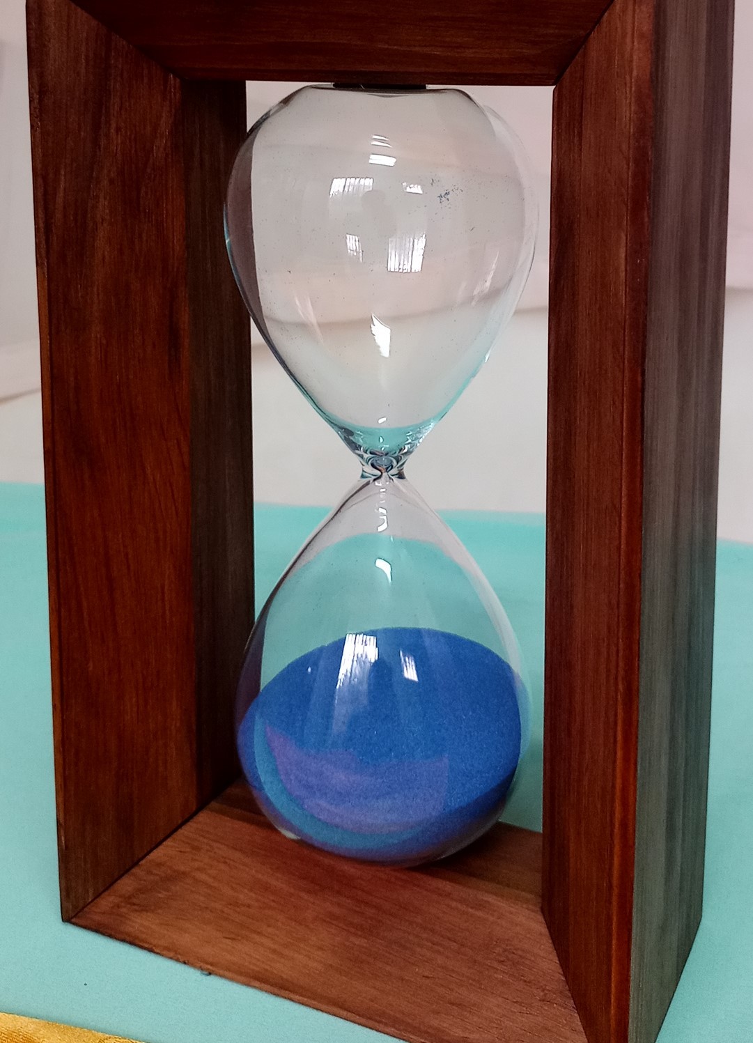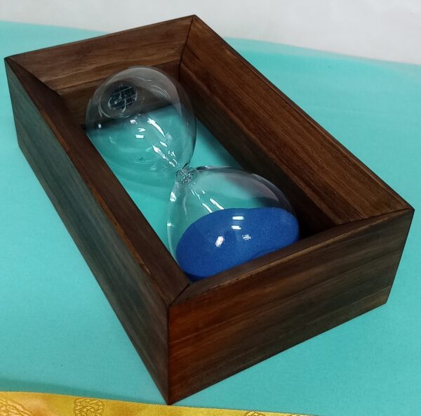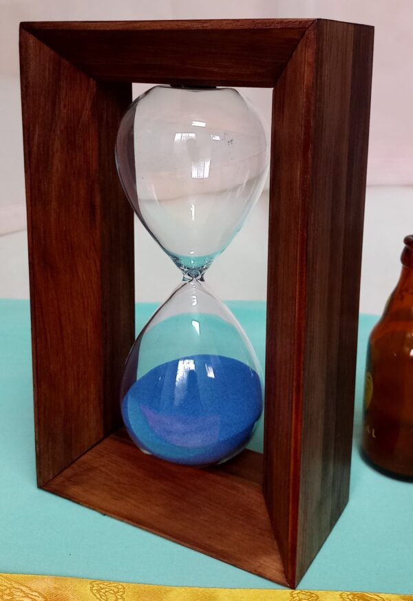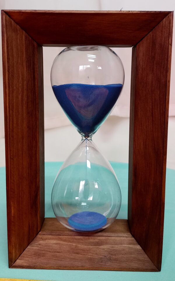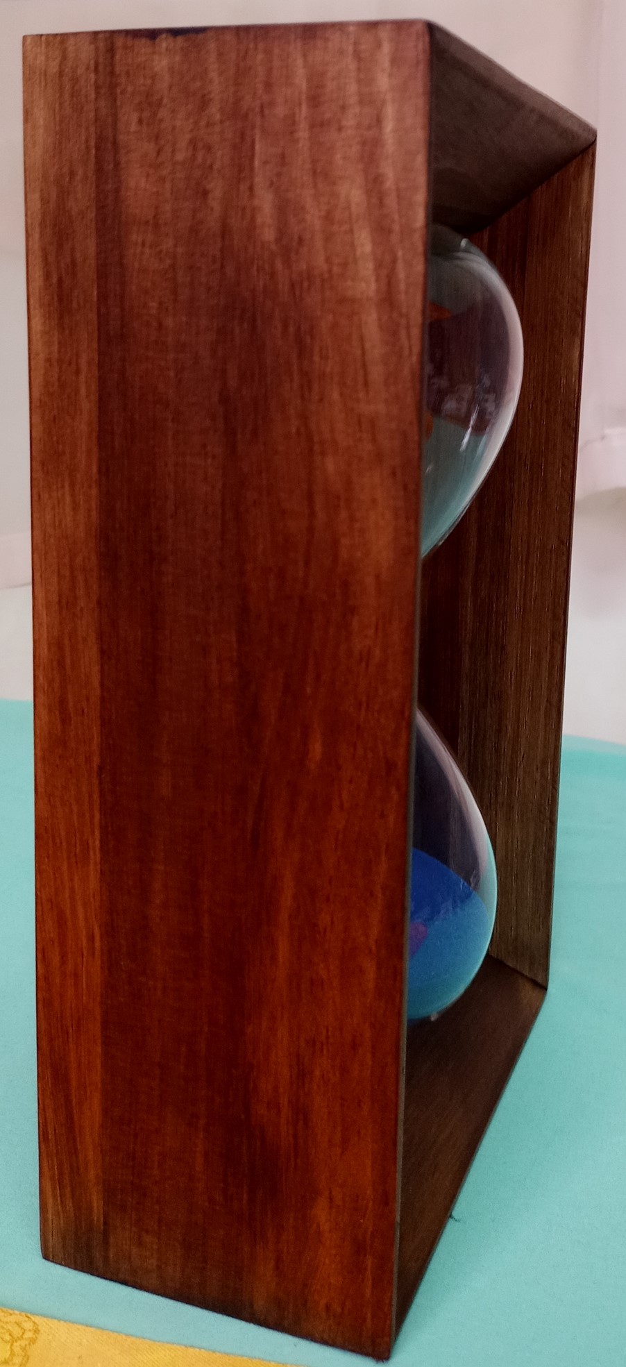 Reloj de arena en madera y vidrio. Perfecto estado. Arena azul.