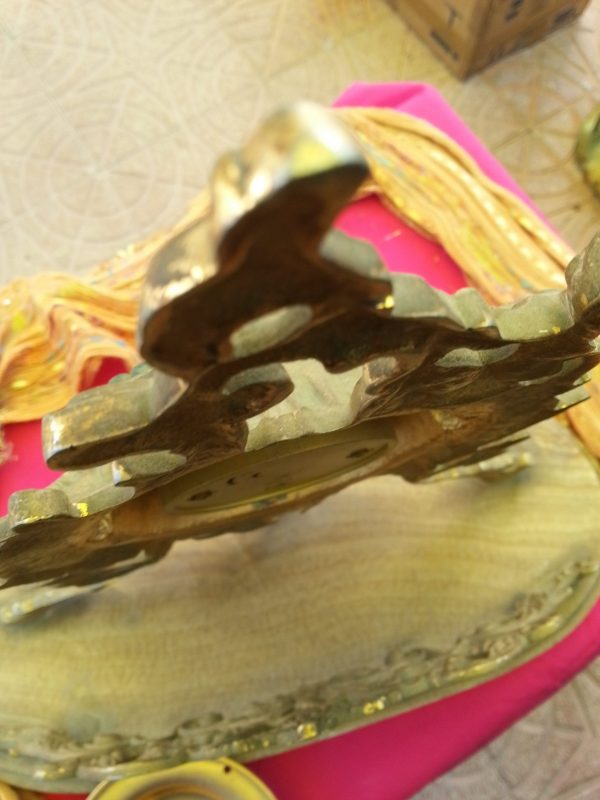 Aproximadamente de los años 80. Fantásticos detalles decoran esta gran reloj de mesa. BUen estado general pero no funciona y no tiene su llave para darle cuerda por eso no sabemos si seguirá funcionando o no.