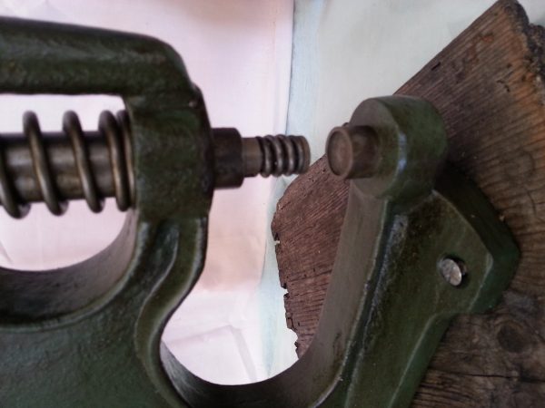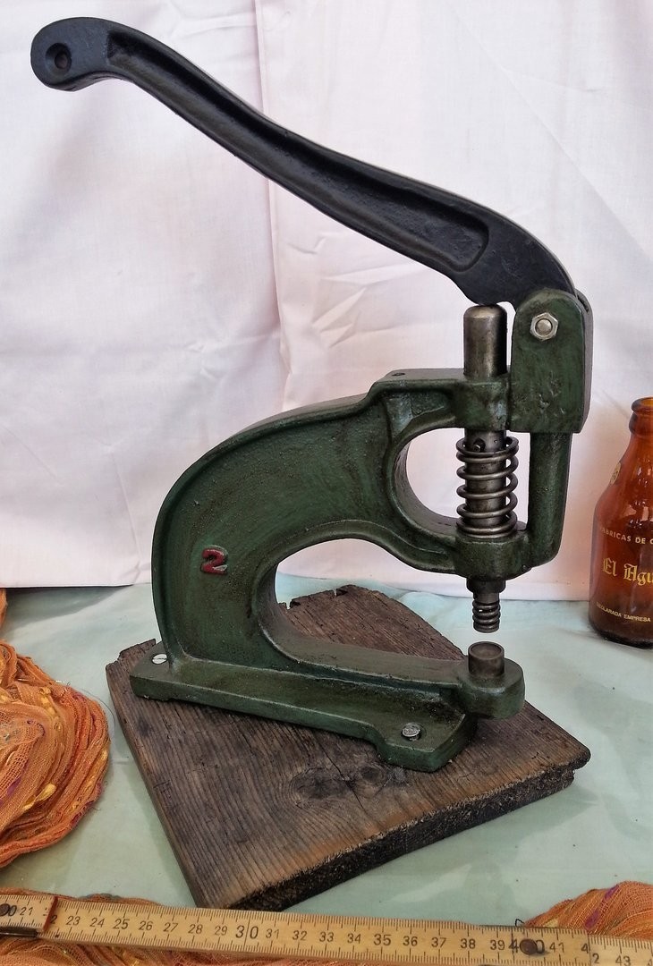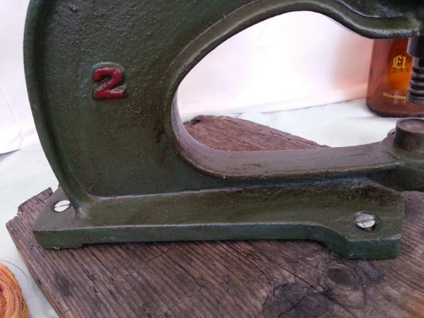 REMACHADORA PRENSADORA DE ZAPATERO. SHOEMAKER REMACHADORA presser: FANTÁSTICA HERRAMIENTA PARA REMACHAR, TROQUELAR O PRENSAR DIVERSOS MATERIALES. FUNCIONA PERFECTAMENTE Y ESTÁ LIMPIA Y AJUSTADA Y PINTADITA… La pieza está fabricada totalmente en hierro. Pequeño tamaño. Mide 35cm de alto * 25 cm de largo. Vieja pero operativa y preciosa para decoración. Atornillada a tabla de madera de 22 cm * 20 cm. Ref. Bib. nº 115