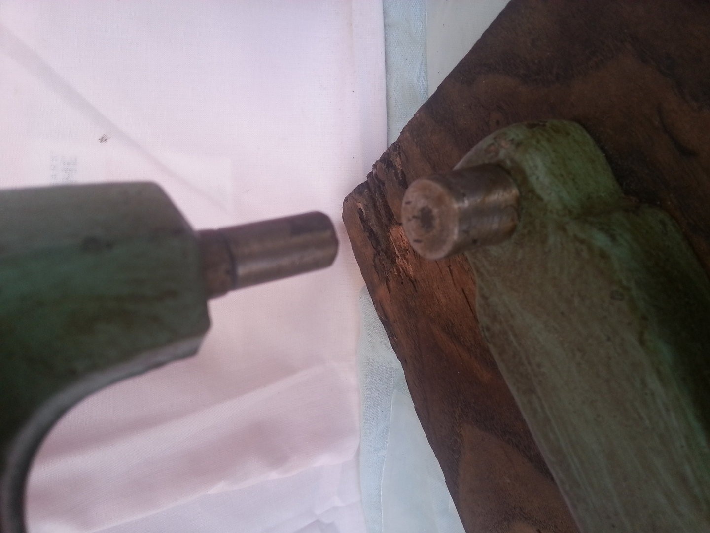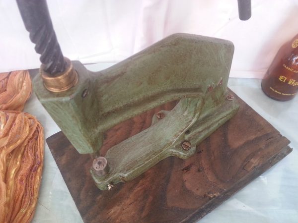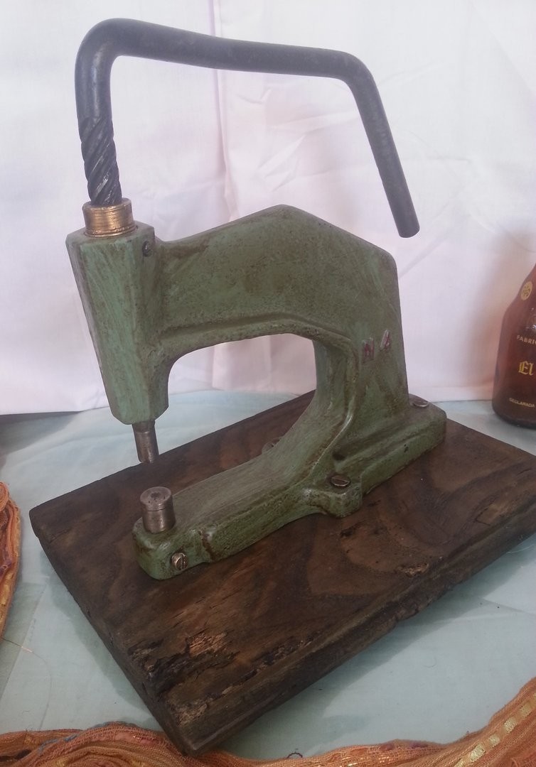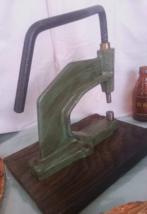 REMACHADORA PRENSADORA DE ZAPATERO. SHOEMAKER presser: FANTÁSTICA HERRAMIENTA PARA REMACHAR, TROQUELAR O PRENSAR DIVERSOS MATERIALES. FUNCIONA PERFECTAMENTE Y ESTÁ LIMPIA Y AJUSTADA Y PINTADITA… La pieza está fabricada totalmente en hierro. NÚMERO 4 Herramienta fuerte y muy pesada. Mide 29 cm de alto * 23 cm de largo. Vieja pero operativa y preciosa para decoración. Atornillada a tabla de madera que mide 28 cm * 20 cm. Ref. Remac. nº 401-A