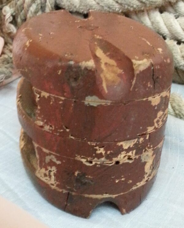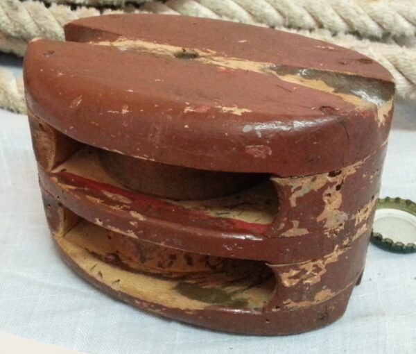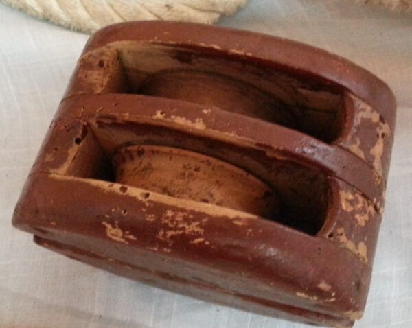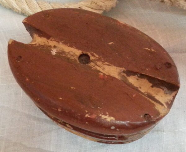 Antigua Roldana. Polea en madera. La soga que aparece en las fotografías es solo de decoración, no se incluye con la polea, sin embargo, tenemos a la venta sogas y cuerdas en diferentes tamaños y grosores.