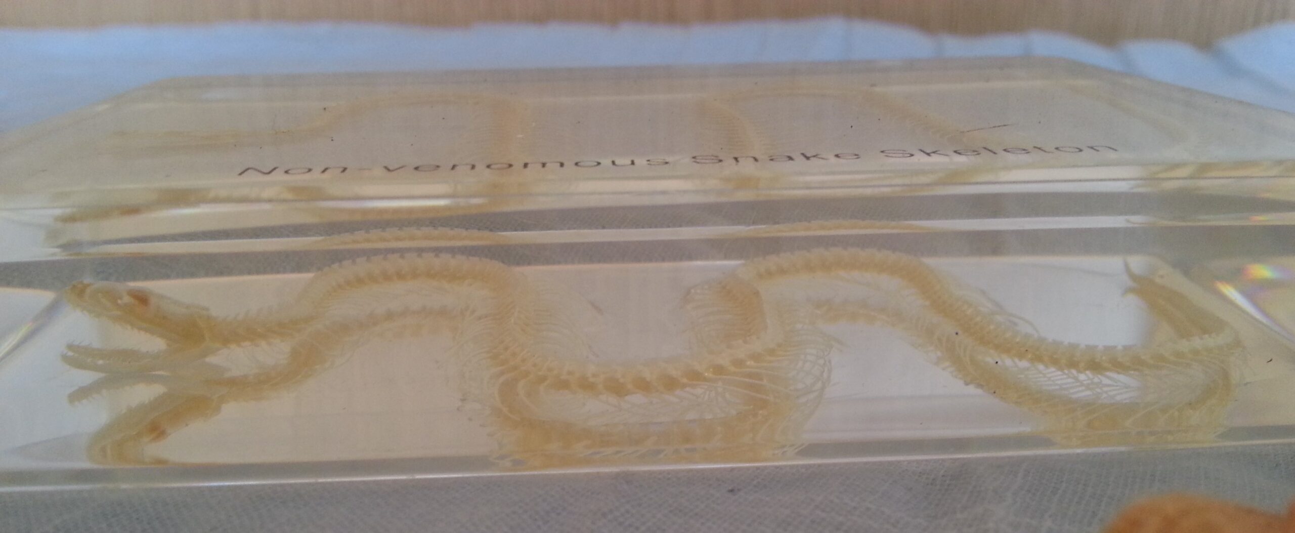 Serpiente esqueletizada. Placa transparente. Especial para asignatura de ciencias naturales en colegios. Esqueleto.