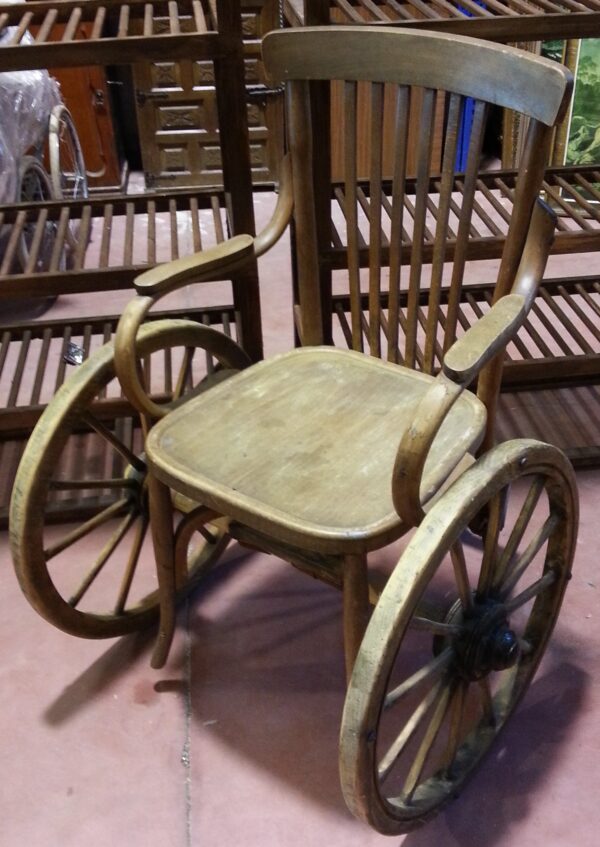 Se trata de una silla de ruedas construida en madera. Operativa.  Esta silla de ruedas se realizó para  rodar unas escenas de estilo del Oeste.