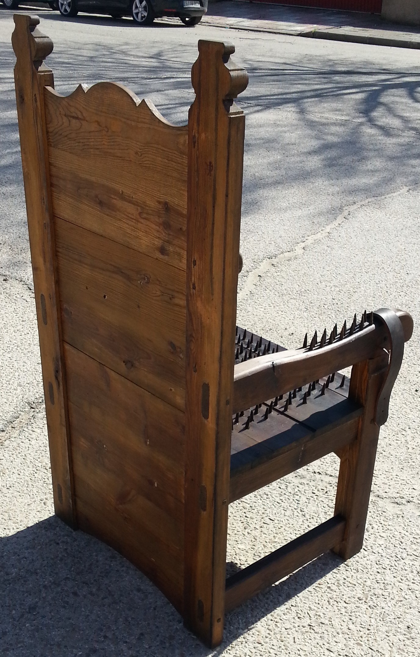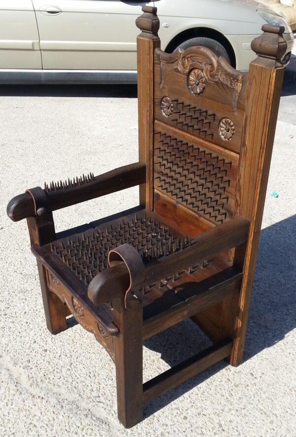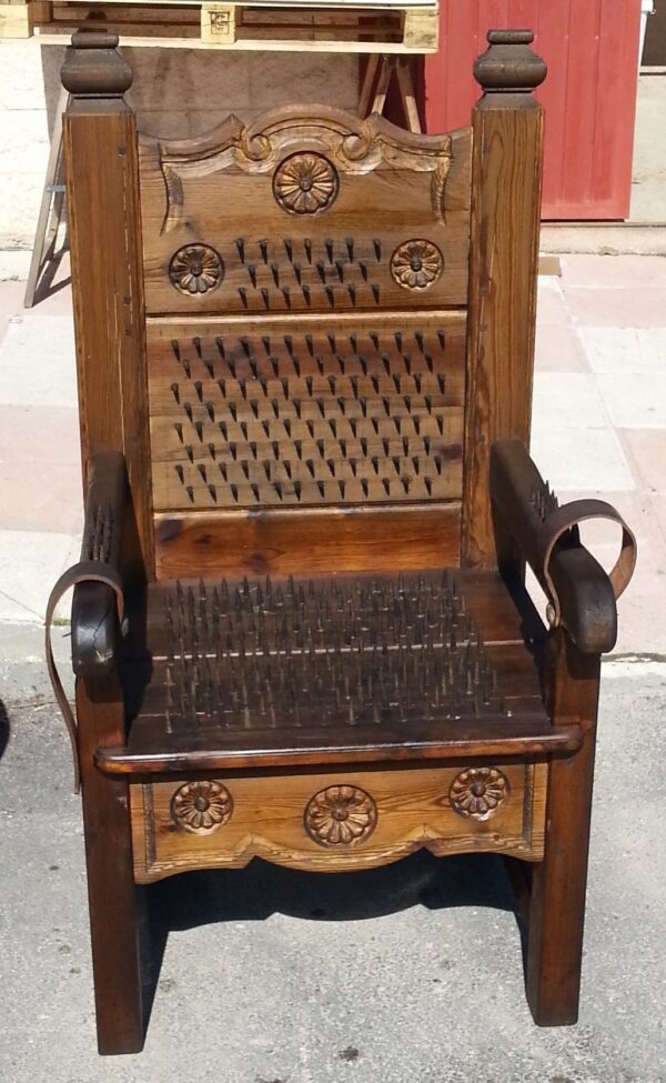 Se trata de una recreación totalmente artesanal de un sillón con multitud de pinchos y púas afilados utilizando madera antigua y hierro para construir este tipo de máquinas de tortura. Fabricadas en nuestras instalaciones de ANTIGUORINCON.COM