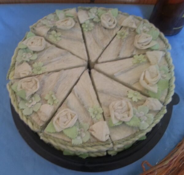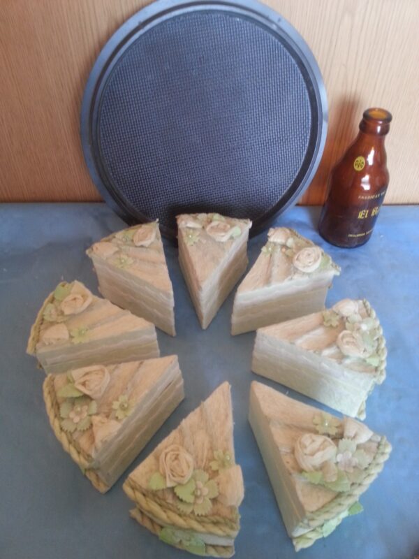 La tarta mide 7,5 cm de alto * 25 cm de diámetro y cada porción mide 7 cm de alto * 10 cm de ancho * 7,5 cm de profundidad. Perfecto estado general.
