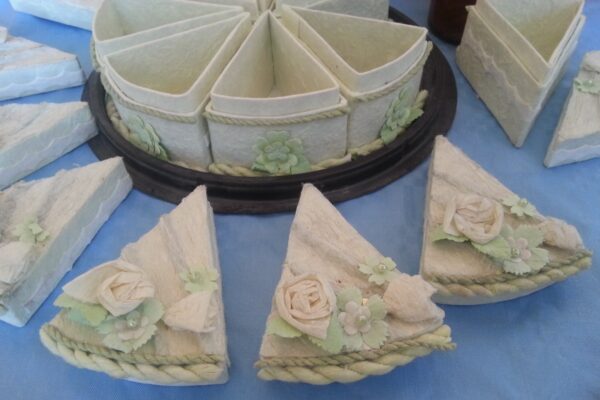 Original tarta de cartón para celebraciones de cumpleaños, aniversarios, comuniones etc… Cada porción de tarta es una cajita de regalo. Tiene 8 porciones.