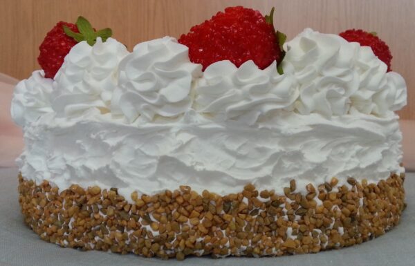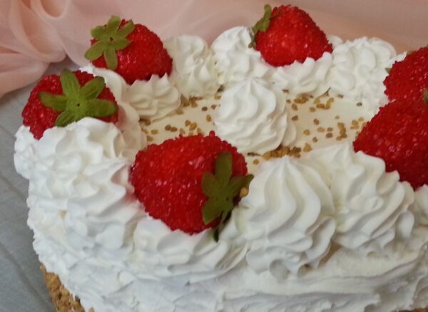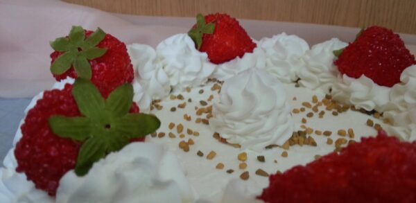Tarta de crema decorada con fresas de imitación.