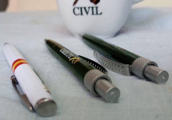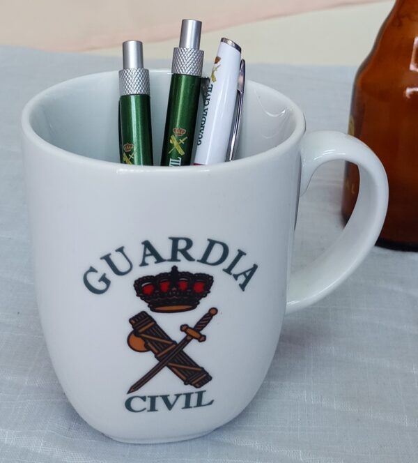 Taza de la Guardia Civil con bolígrafos también serigrafiados.
