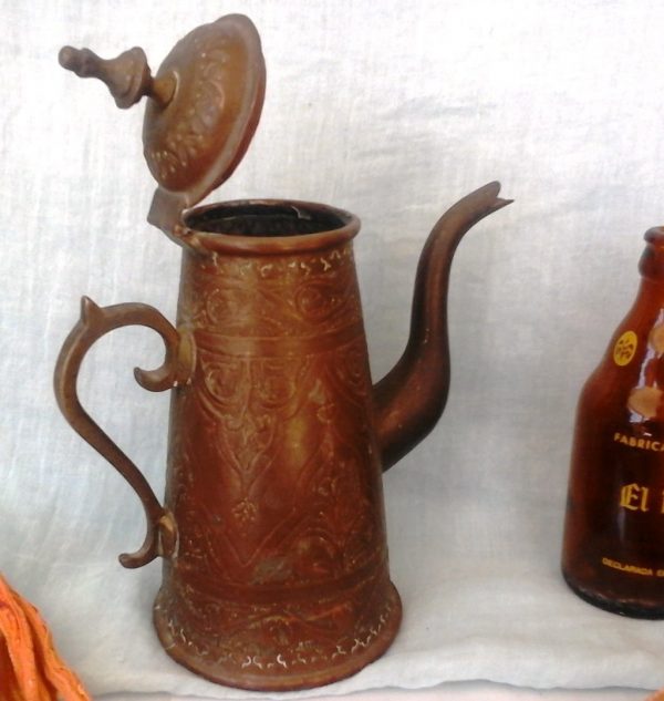 Repujada y emblemática. La tetera mide 20 cm de alto * 19 cm de ancho total.