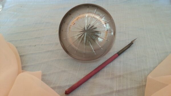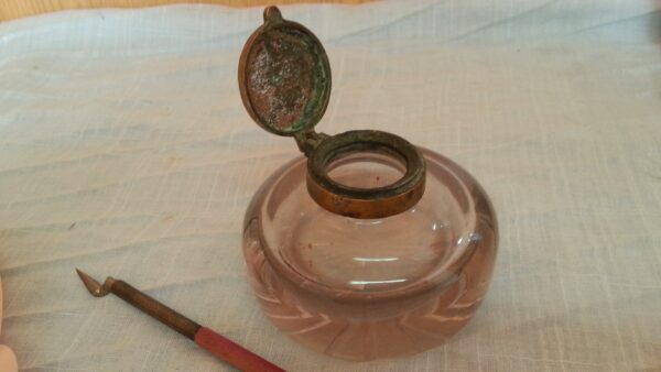 Tintero en vidrio. Año 50. Con vieja plumilla.