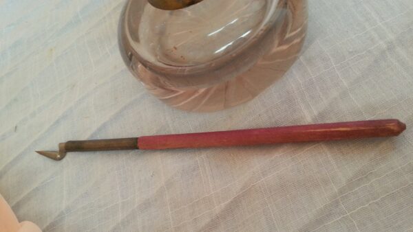 Antiguo tintero en vidrio. Incluye plumilla de madera.