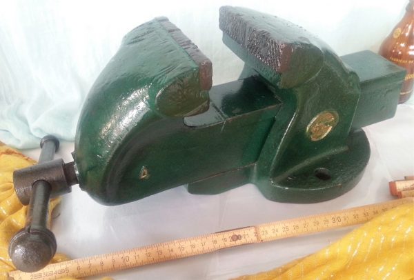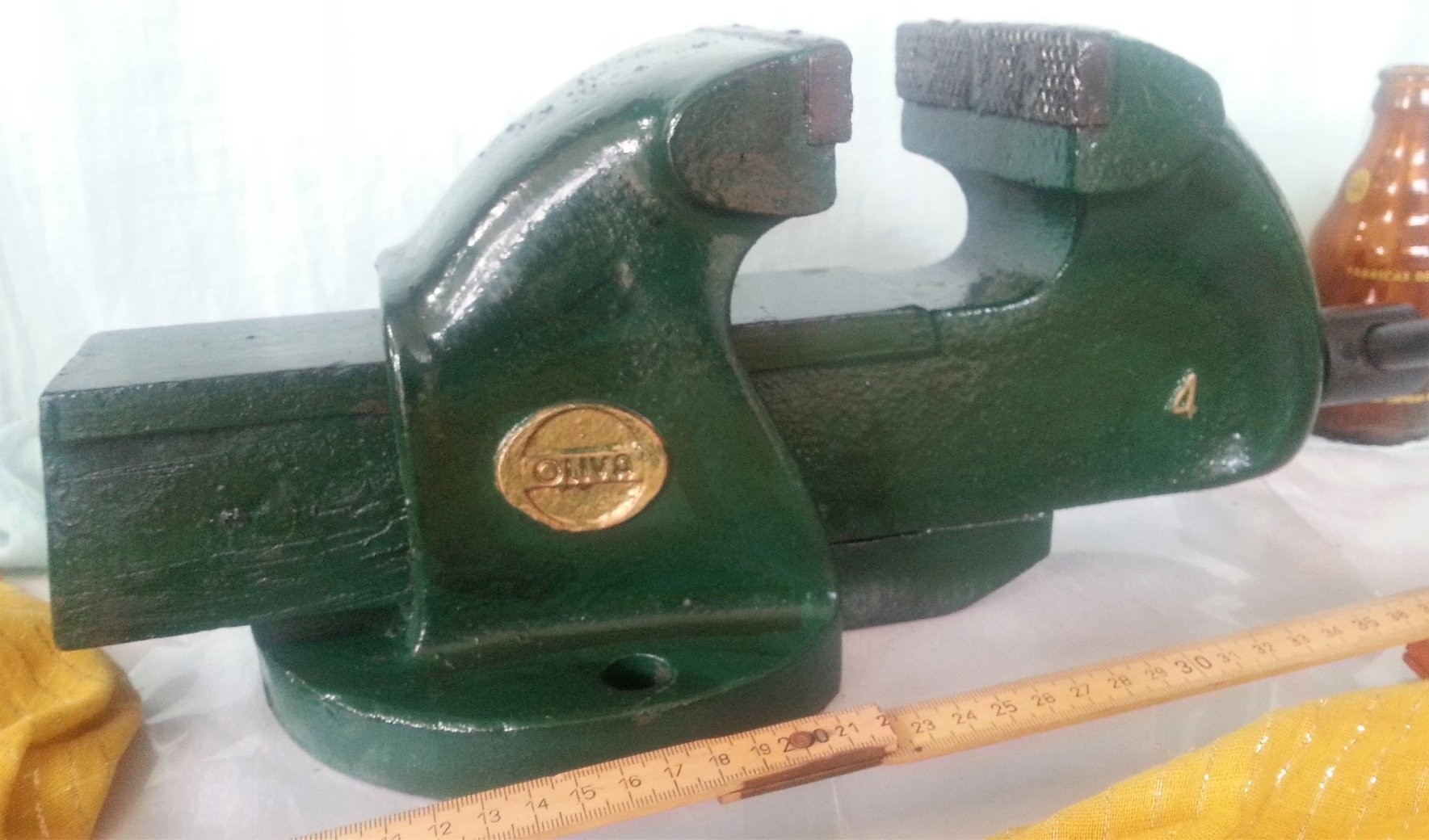 Muy fuerte y pesado. Útil totalmente. Marca OLIVA número 4 de los más grandes fabricados. Buen estado. Aprieta fuerte gracias  a su manivela pero el muelle de retroceso está viejo y cuando se afloja su manivela hay que empujarle hacia fuera con la mano.