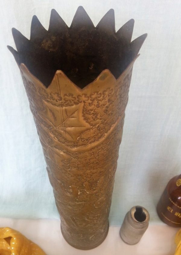 VIEJA VAINA DE ARTILLERÍA. INERTE. EN PESADO LATÓN. DECORADA. VAINA PEQUEÑA DE REGALO: