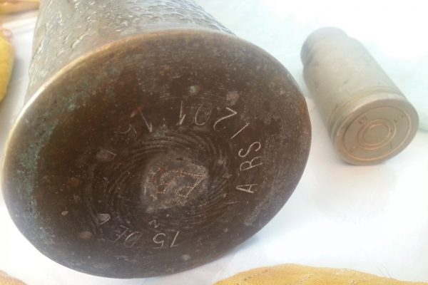 Vieja vaina de artillería. Inerte. En pesado latón. Decorada. Vaina pequeña de regalo.