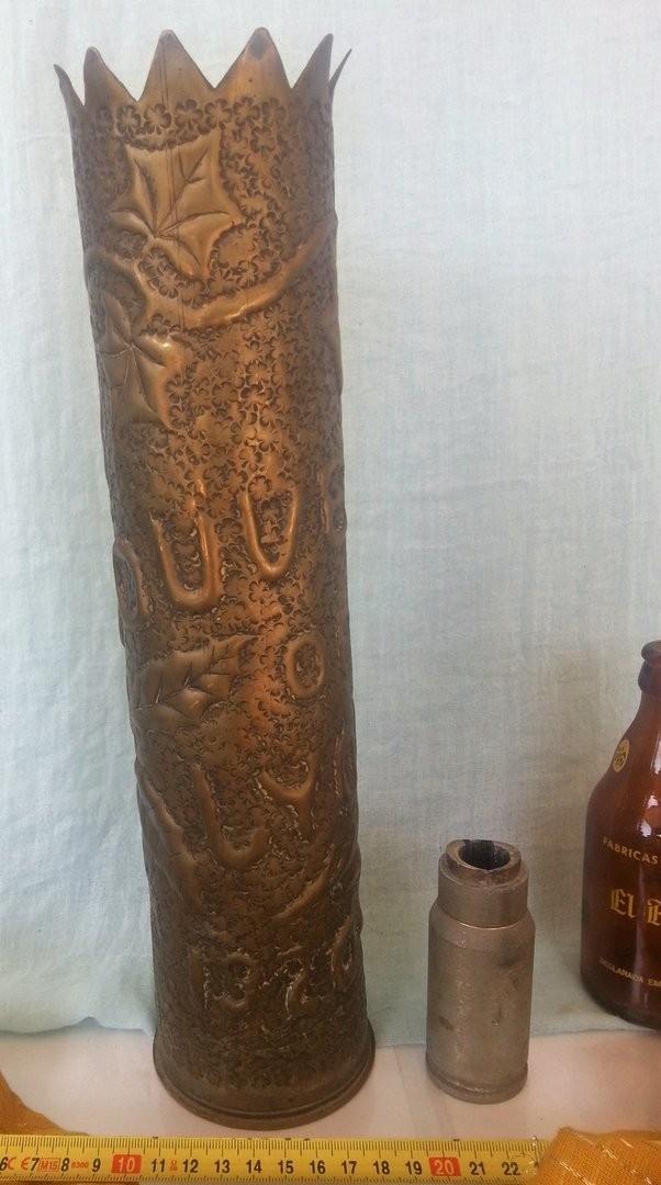Buen estado general. Inerte. Totalmente vacía. Tal cual se puede ver en las fotos. Decorada y repujada por todo su contorno. Mide 35 cm de largo * 8,5 cm de diámetro y la vaina chiquitita 9 cm de largo * 3,5 cm de diámetro y va de regalo.