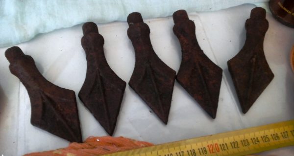 Conjunto de 5 puntas de lanza en hierro para reutilizar o decorar. Están sucias y con restos de óxido porque son muy antiguas.