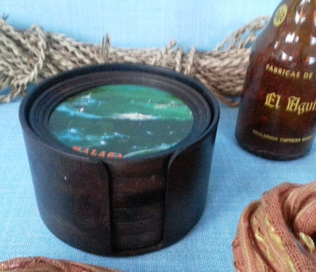 VIEJO JUEGO POSA-VASOS MALAGUEÑO. AÑOS 70: Señales de uso por los años utilizados peroemblemáticas las instantáneas de paisajesde Málaga que representan. Mide cada uno 11 cm de diámetro. Ref. nº 434