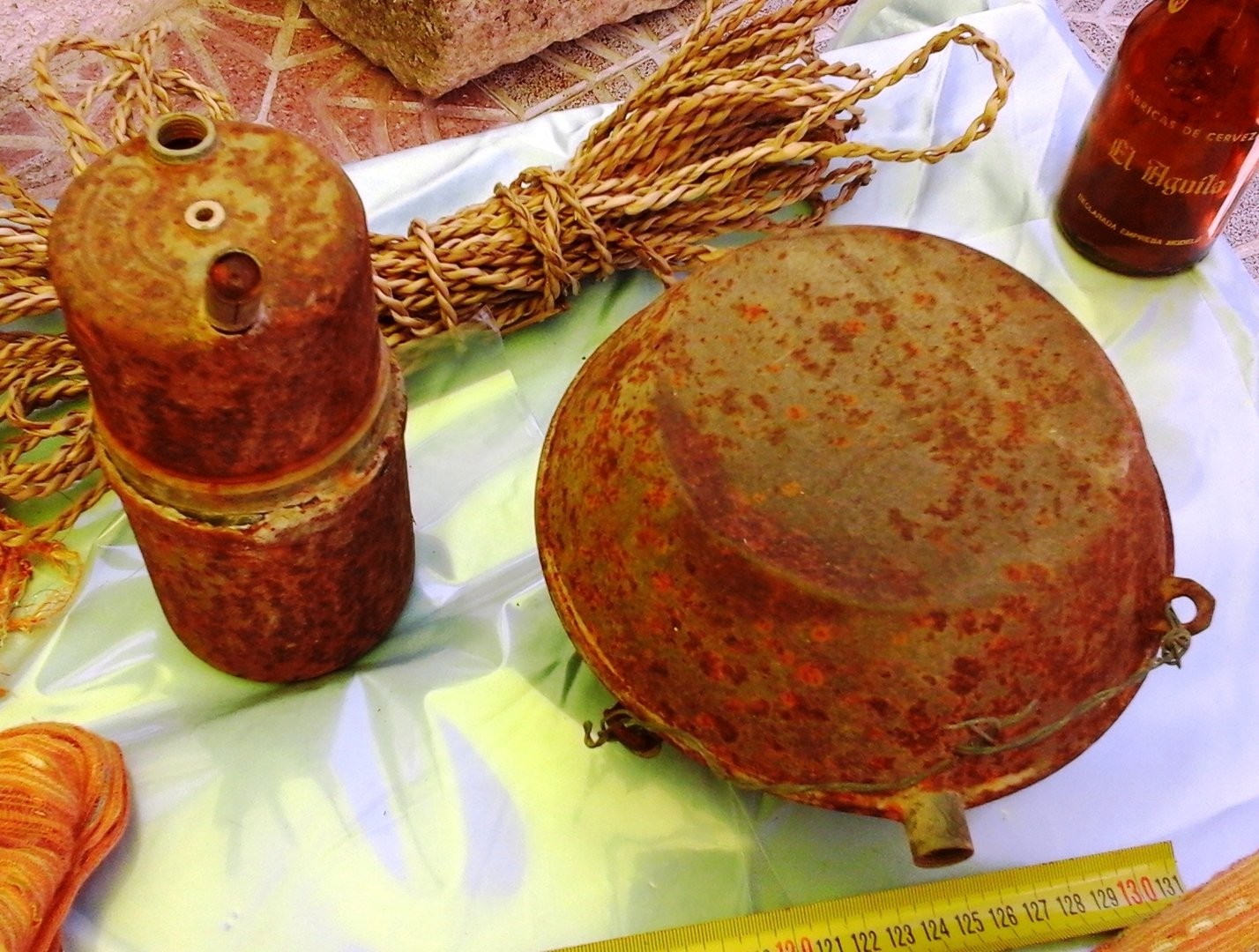 Viejos carburo y cantimplora. Pareja. Oxidados y maltratados por el tiempo. Sólo decoración