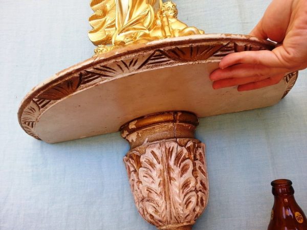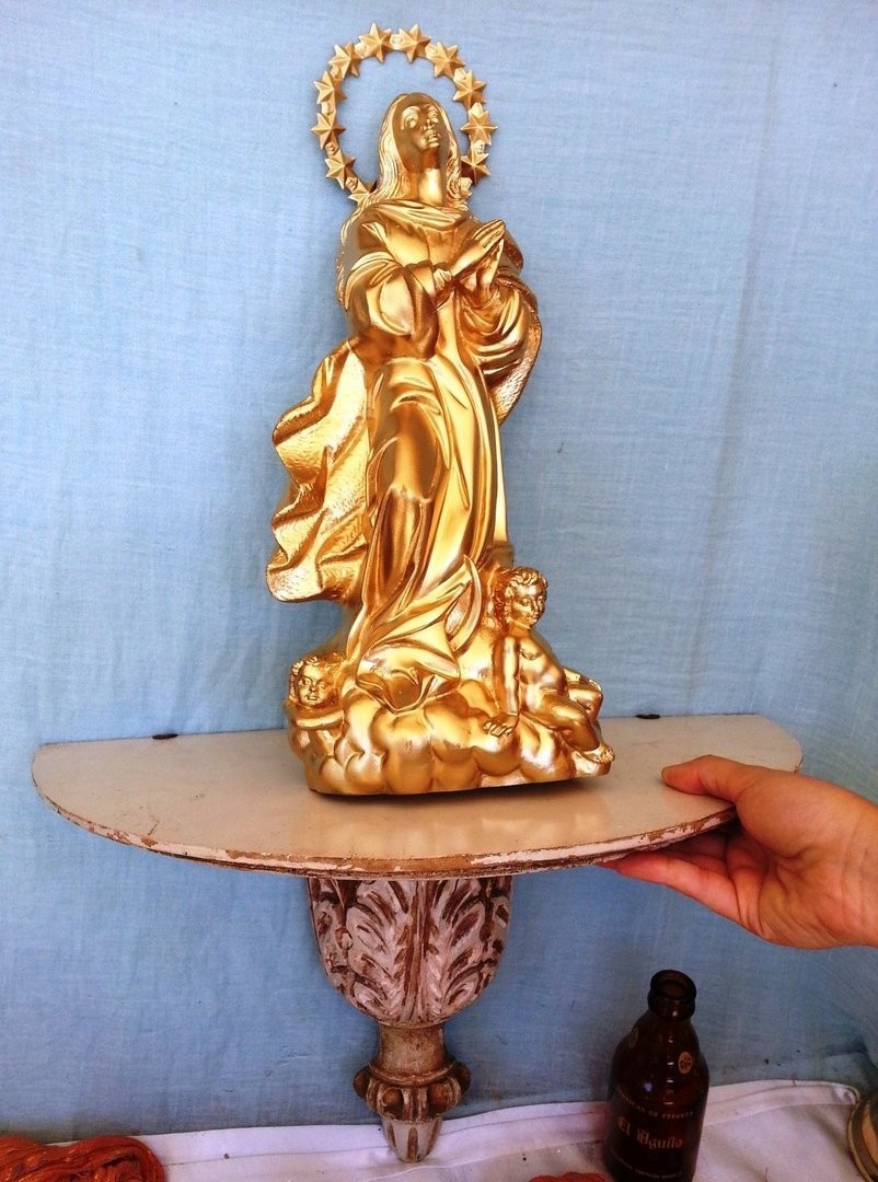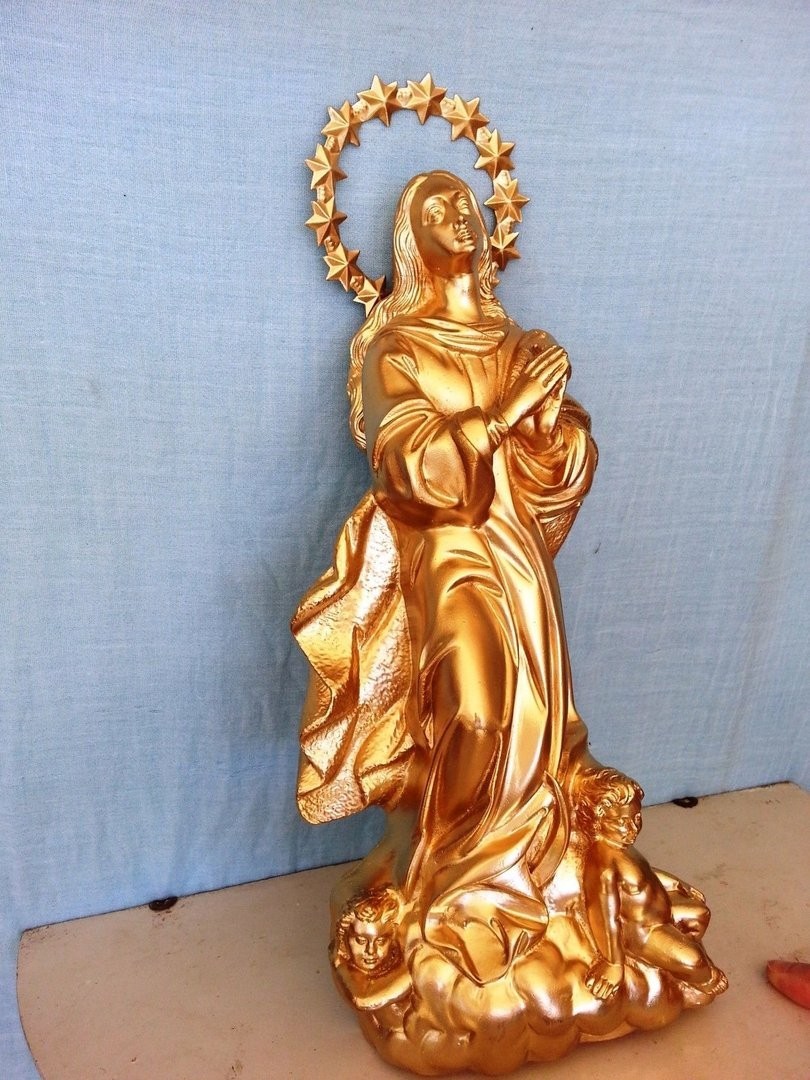 La figura está construida en resina y es bastante pesada. La he lijado y pintado de dorado y la peana es mucho más antigua y trabajada en madera, resultando un precioso conjunto para decorar cualquier rincón de su hogar o capilla.