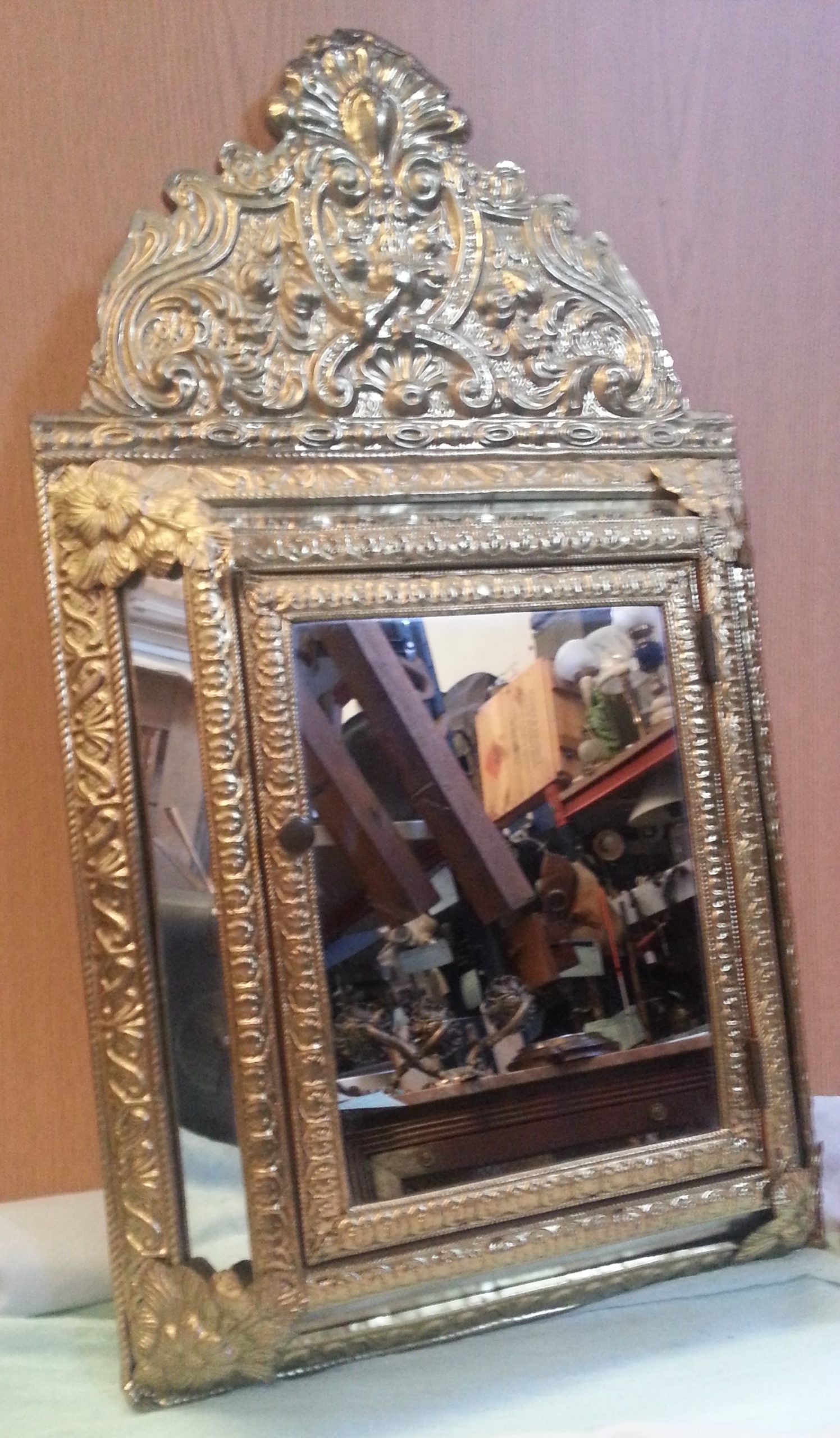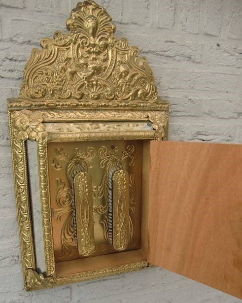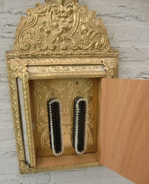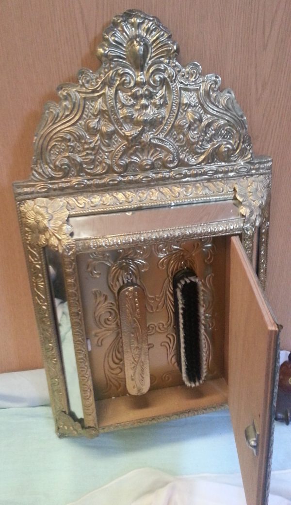Vitrina espejo guarda cepillos. En cobre, espejo y madera. Años 60