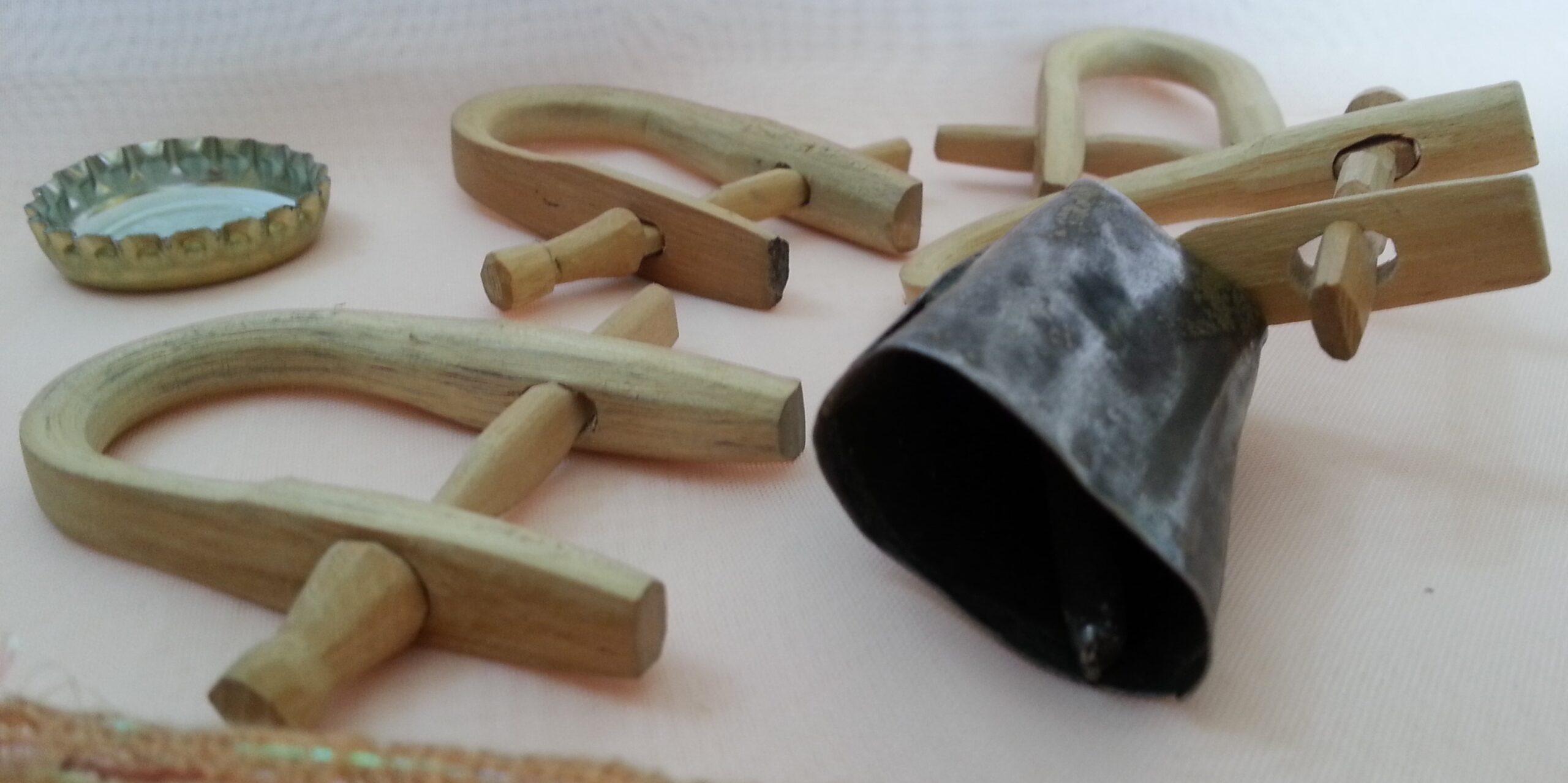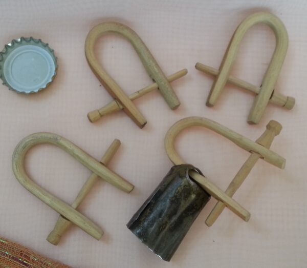 Es una colección de 4 yuguetas en miniatura fabricados en madera. Acompaña al lote un cascabel de 4 cm de altura.